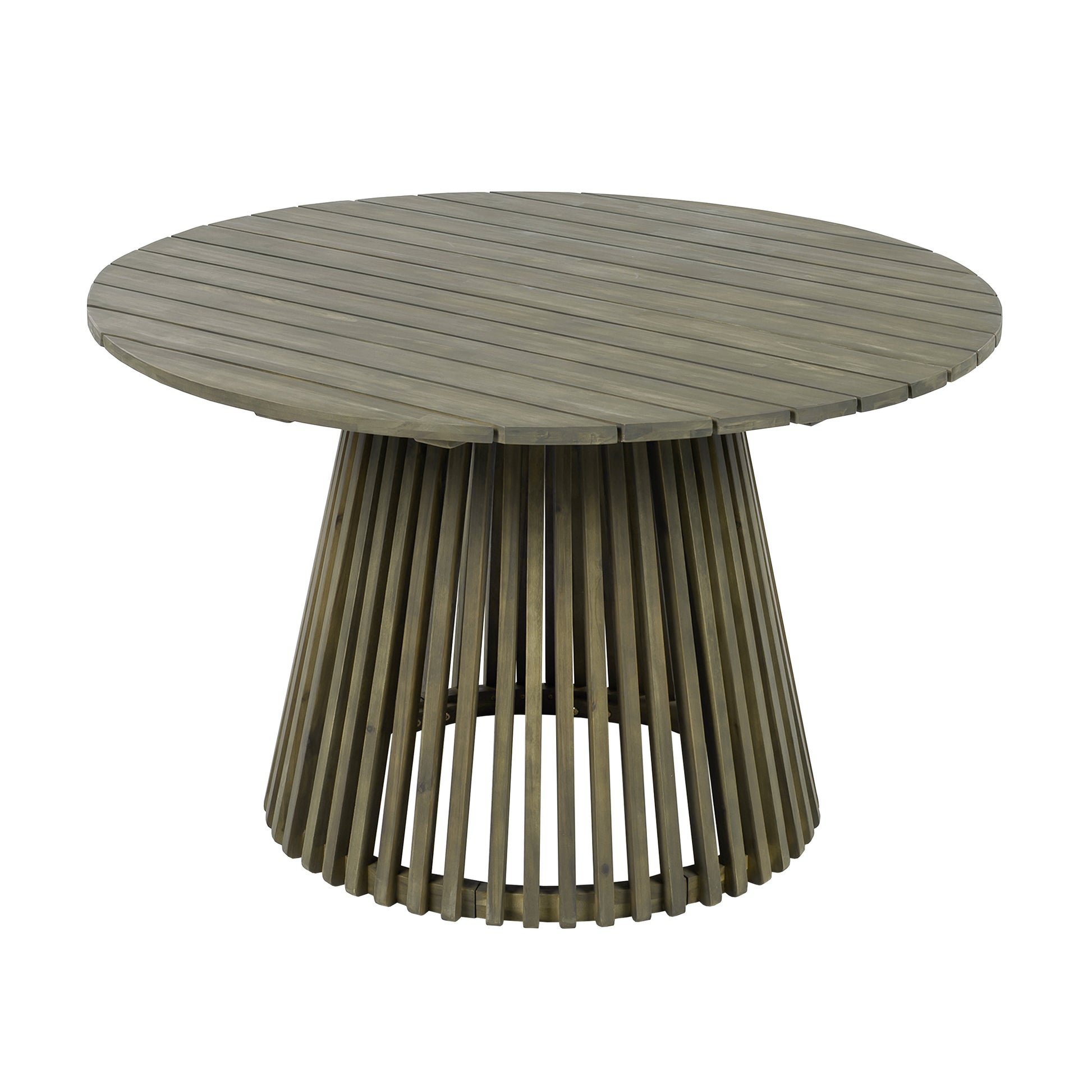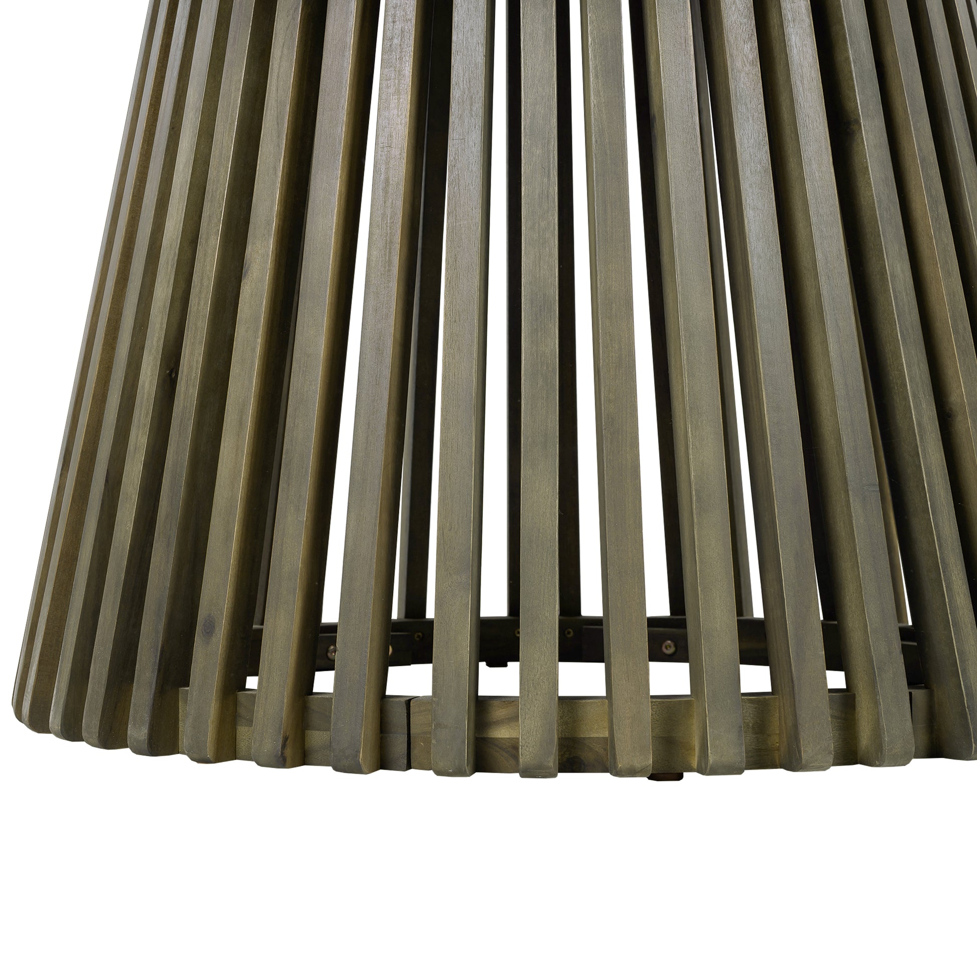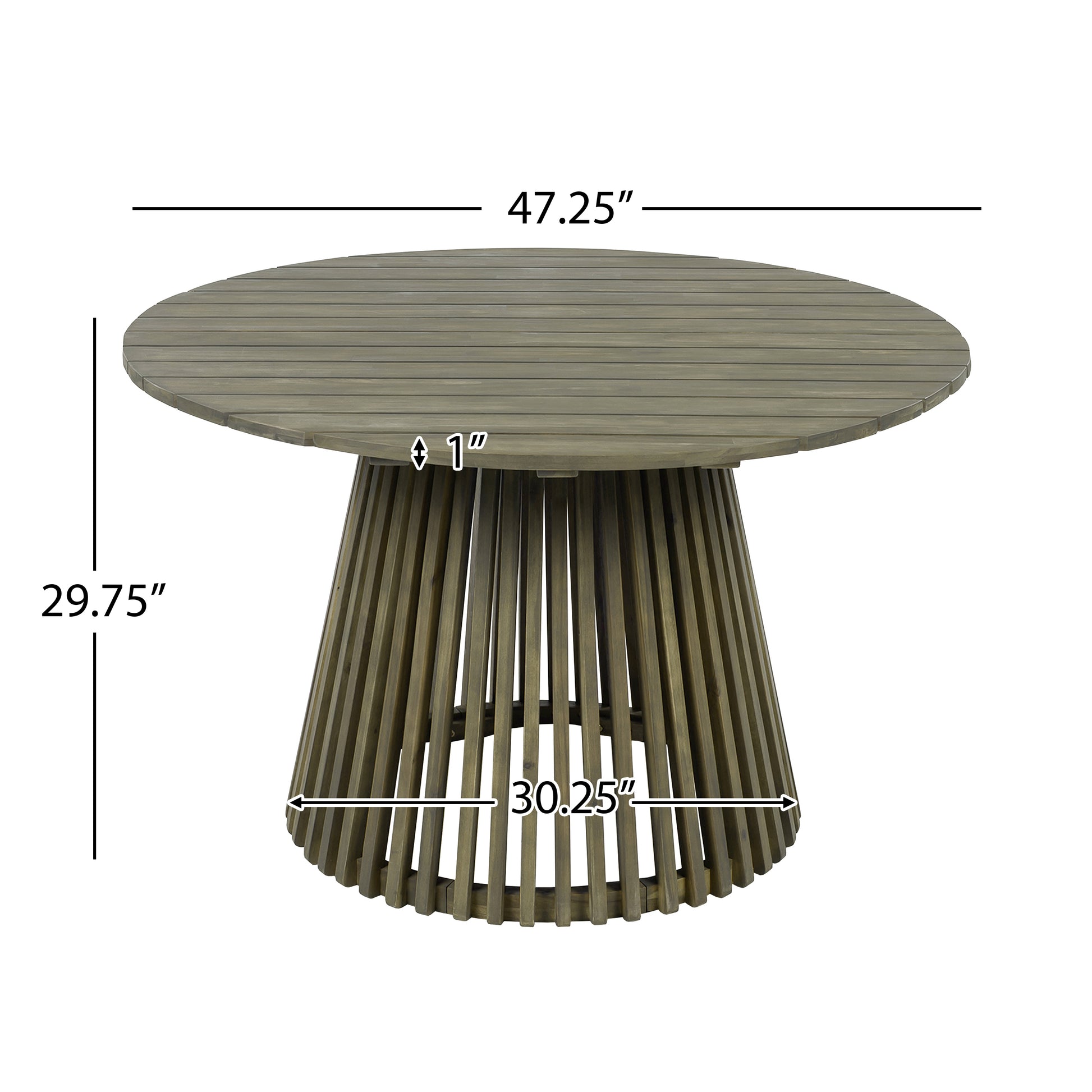 - Stylish & Sturdy Dining Table:The DINING TABLE impresses with its 47.25-inch diameter circular top and 29.75-inch height, supported by a distinctive slatted base made of Acacia wood. This unique base not only elevates the table’s aesthetic but also ensures it can bear up to 300 lbs of weight. The Grey Finish complements the chairs seamlessly, while the solid wood construction guarantees reliability in any outdoor setting.