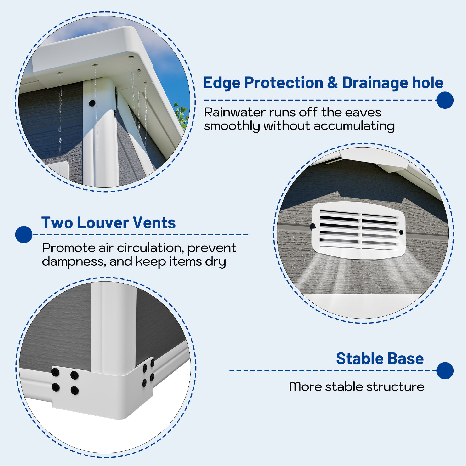 - STABLE & WELL-THOUGHT-OUT CONSTRUCTION: Our garden shed is equipped with a sturdy frame structure. Integrated drainage holes and ventilation slots ensure optimal air exchange and effectively prevent moisture buildup and condensation. This reliably protects your stored items from rain, dampness, and mold. The lockable doors provide additional security for your belongings.