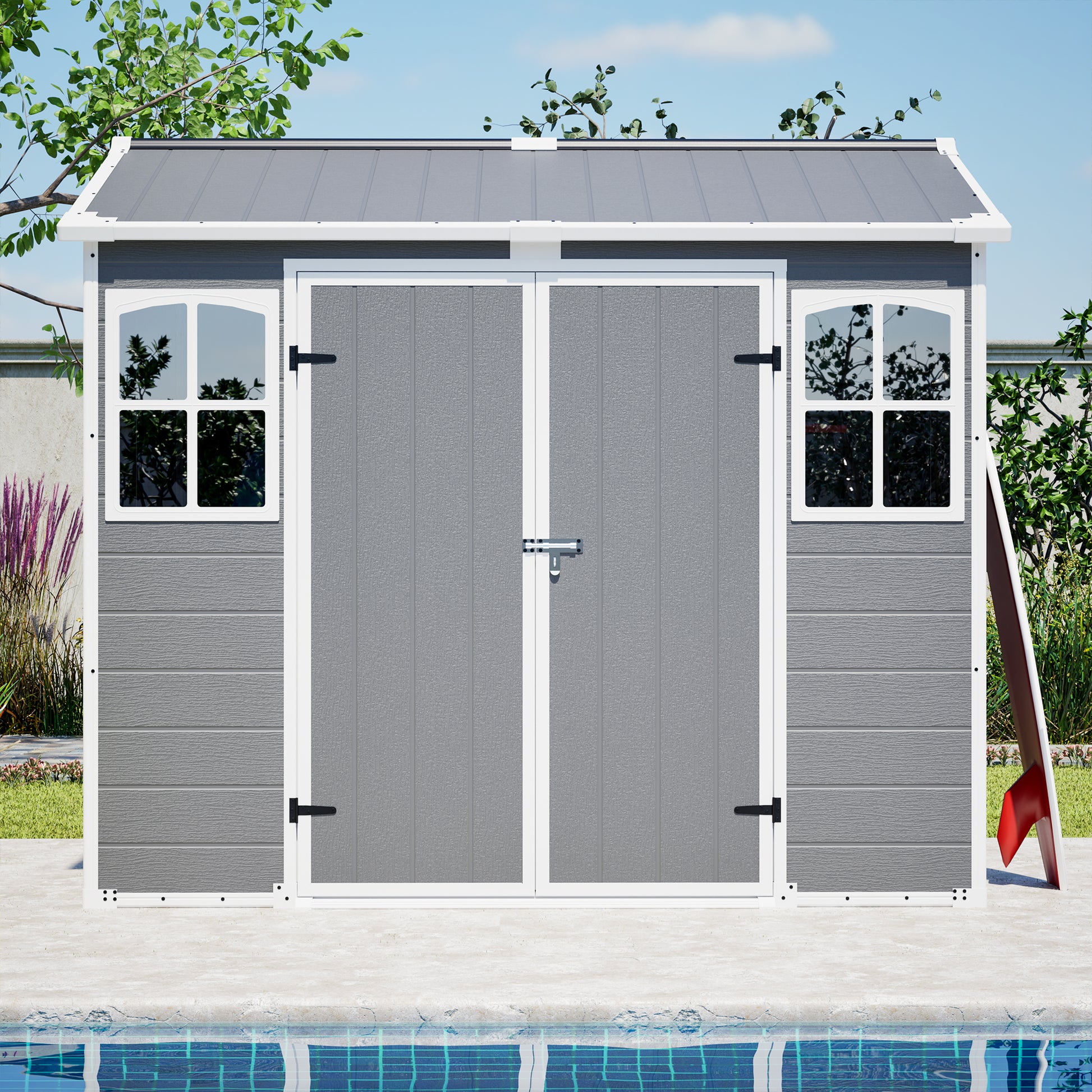 Plastic Utility Shed 8x6 ft with Floor – Lockable Storage Shed for Garden Tools & Trash Bins, All-Weather Outdoor Organizer in Gray-White