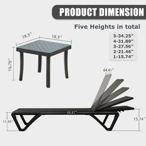 - High-Quality Material- This chaise lounge outdoor comes with sturdy aluminum frame and premium Texitilene fabric, which is durable and resistant to weather conditions. And the Texitilene fabric is a lightweight material that is breathable and quick dry, allows air to circulate and ventilates body heat on a hot day.