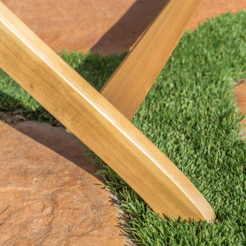 - Crafted from weather- and water-resistant acacia, it features an x-shaped base and a slatted top that prevents water from pooling after a storm