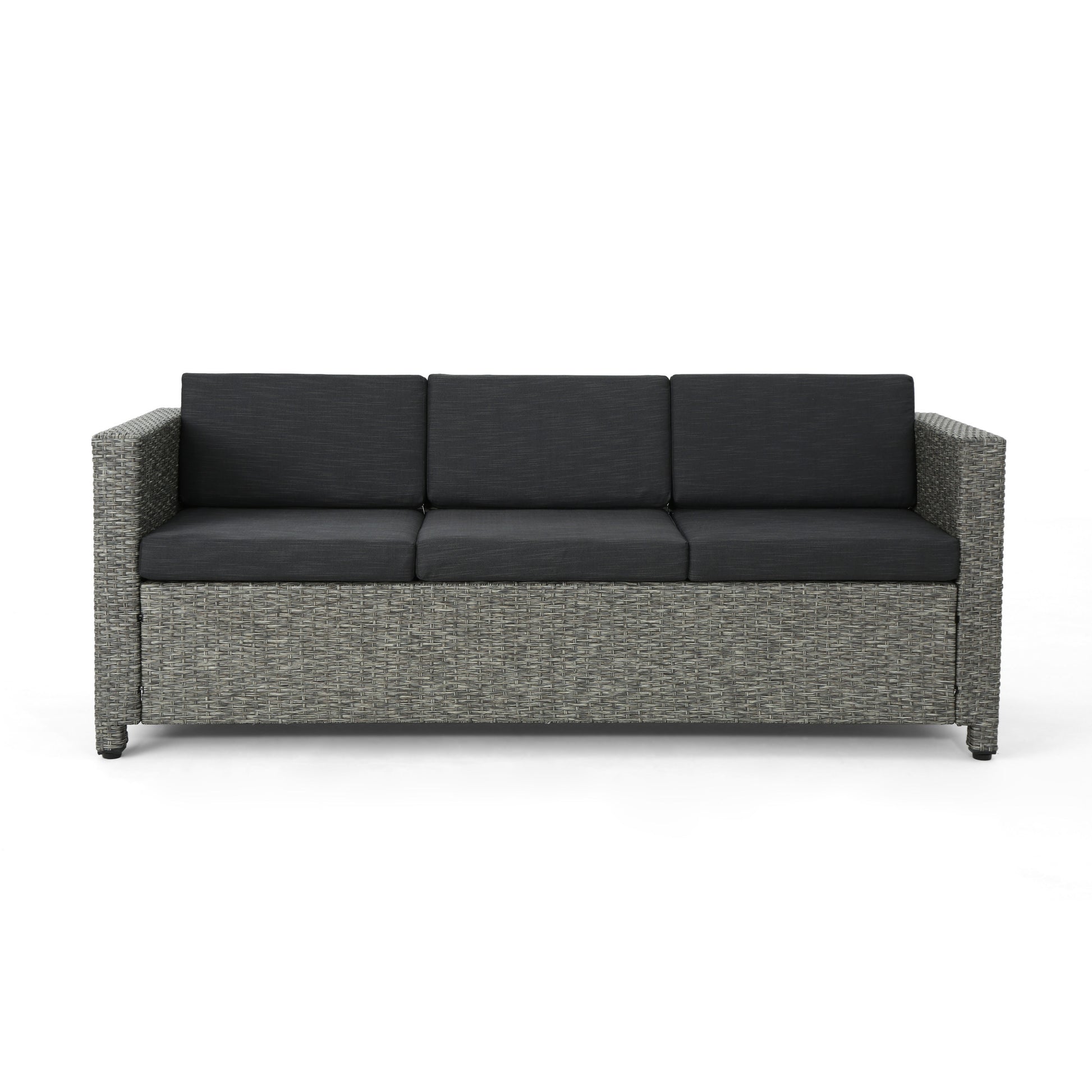- Includes: one (1) sofa. Material: Polyethylene wicker. Frame material: steel