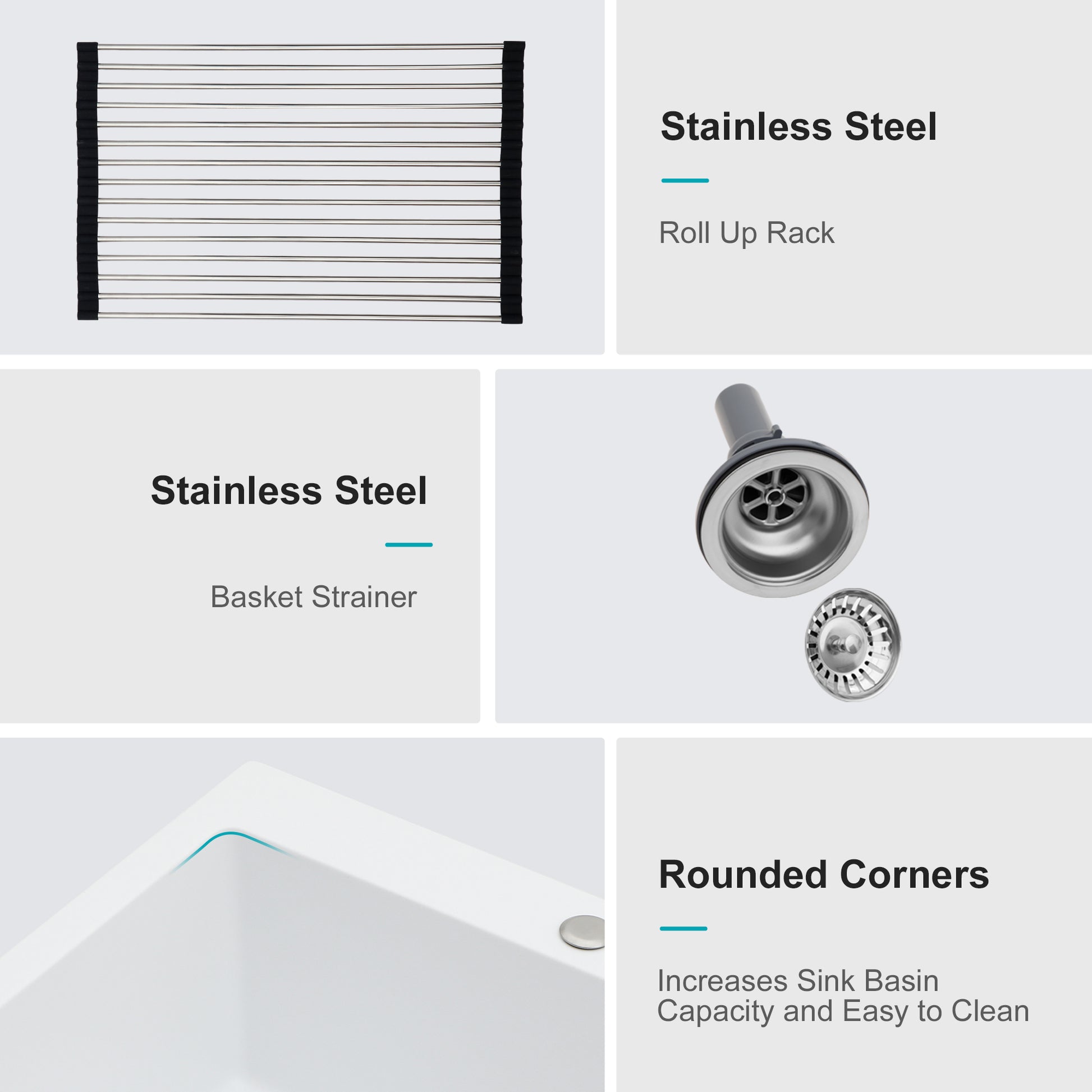 Quartz Kitchen Sink - 25 x 22" x 9.65" White Granite Composite Drop-in Single Bowl Kitchen Sink