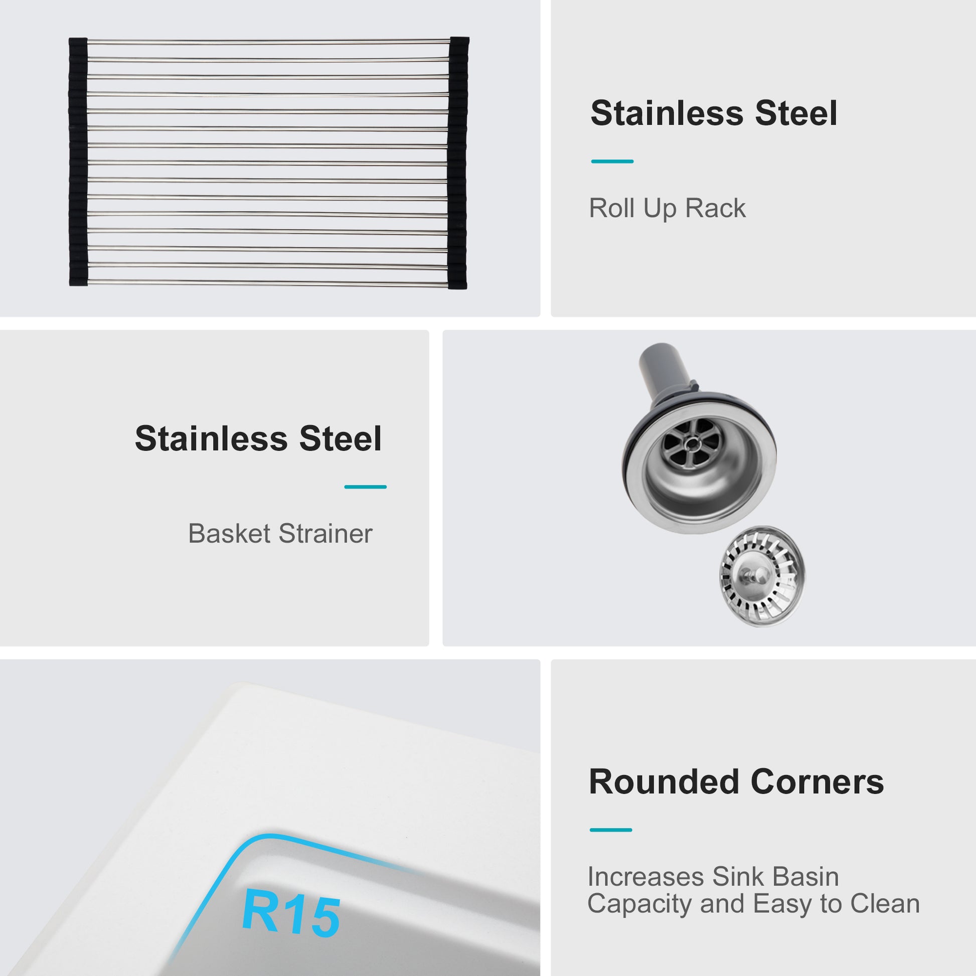- Package included:1 x Sink, 1 x Drying Roll-up Rack, 1 x Baskets Strainers Assembly, 1 x Bottom Grid, 1 x cutting board, 1 x colander, 1 x installation clips, 1 x cutout template and installation Guide.