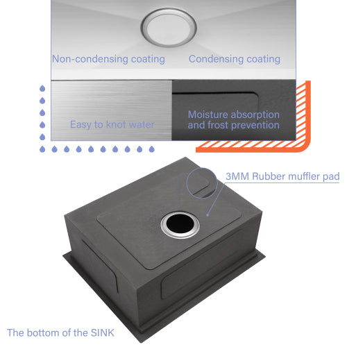 - [Coating and Silencer Pad] There is a thick coating on the outside of the sink to prevent condensation caused by weather changes. In addition, the 3mm thick rubber silencer pad can greatly reduce the noise from the faucet and give you a quieter cooking environment.