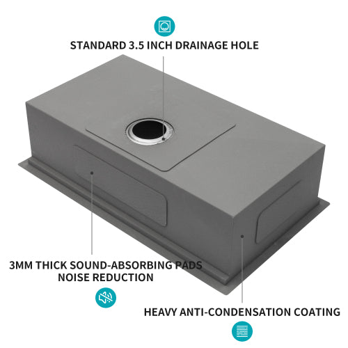 - [Coating and Silencer Pad] There is a thick coating on the outside of the sink to prevent condensation caused by weather changes. In addition, the 3mm thick rubber silencer pad can greatly reduce the noise from the faucet and give you a quieter cooking environment.
