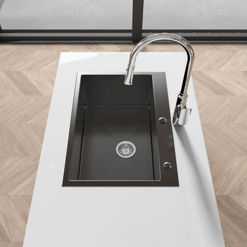 Stainless Steel Kitchen Sink, 27″x19″ Single Bowl, Overmount Handmade Sink in Black, with US Standard Drain and Hook, LS-SSBL01