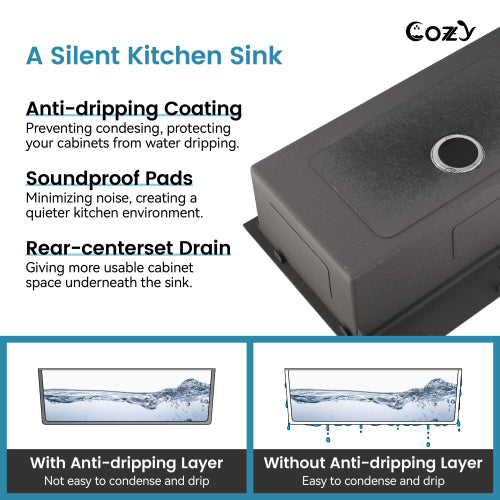 - EFFECTIVE NOISE REDUCTION: The outer side of the sink's bottom is not only covered with sound-dampening pads but also sprayed with damp-proof paint coating to achieve the effect of noise reduction and moisture absorption, making the sink quieter to use and reducing condensation at the bottom of the sink.