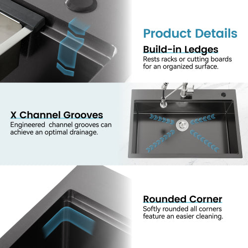 Stainless Steel Kitchen Sink, 33″x22″ Single Bowl, Overmount Handmade Sink in Black, with Cutting Board, Colander