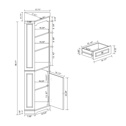 - Ample storage space and Space Saving: With its 90° right-angle corner design, this corner cabinet makes the most out of those underutilized spaces. It features 1 door, 1 drawer and 5 layers storage shelves, including 1 adjustable top shelf, providing you with the flexibility to store a variety of items, delivers generous storage while taking up minimal floor space—ideal for tight corners and narrow areas.