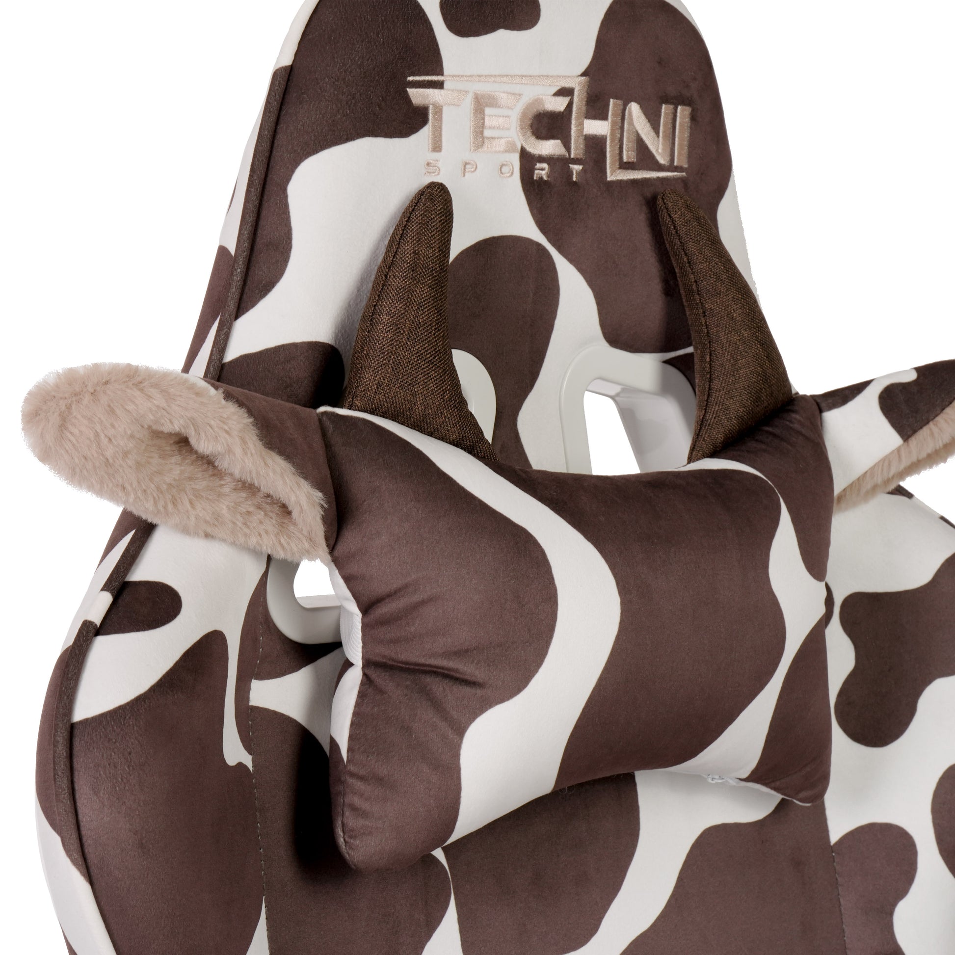 - Cow headrest pillow with elastic strap: white ears + brown horns