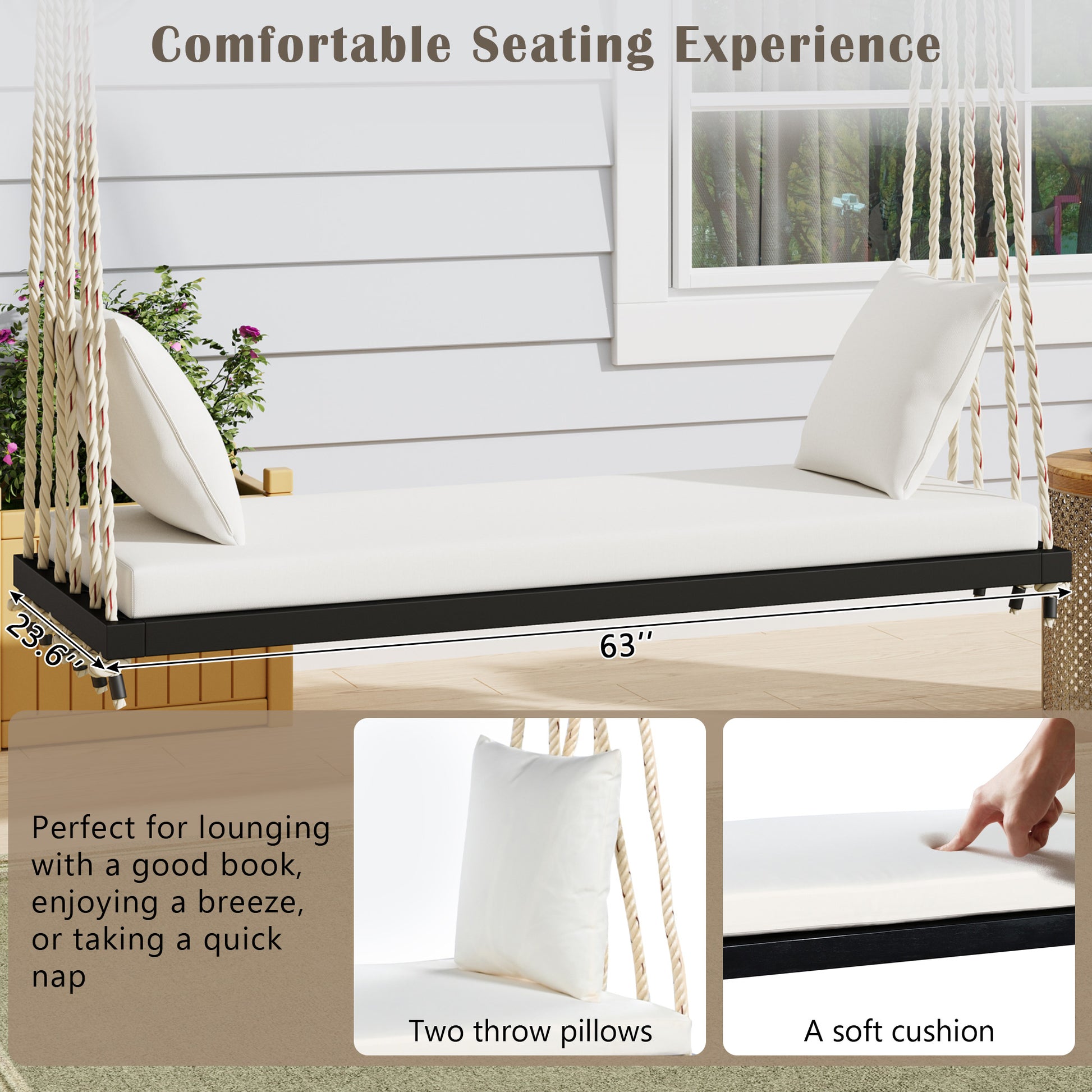 - [Comfortable Seating Experience]Relax on the generously sized 63Lx23.6W inch seat, complete with a soft cushion and two throw pillows. The well-designed seating provides superior comfort, perfect for lounging with a good book, enjoying a breeze, or taking a quick nap in your lawn or garden.