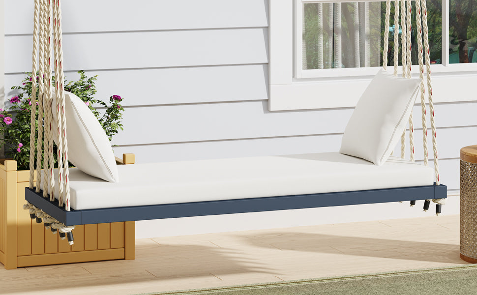 - [Dimension&Notice] Overall size:63.0x23.6x2.0inch(LXWXH), Seat Cushion: 59.4x23.6x2.8inch; Pillow:15.7x15.7x4.7inch;Each rope length:10.8ft. Notice: Swing must be supported by adequate structure to avoid falling. To prevent personal or property damage, all swings should be installed by a Licensed Building Contractor. Hanging hardware is not included as it needs to be determined on site.