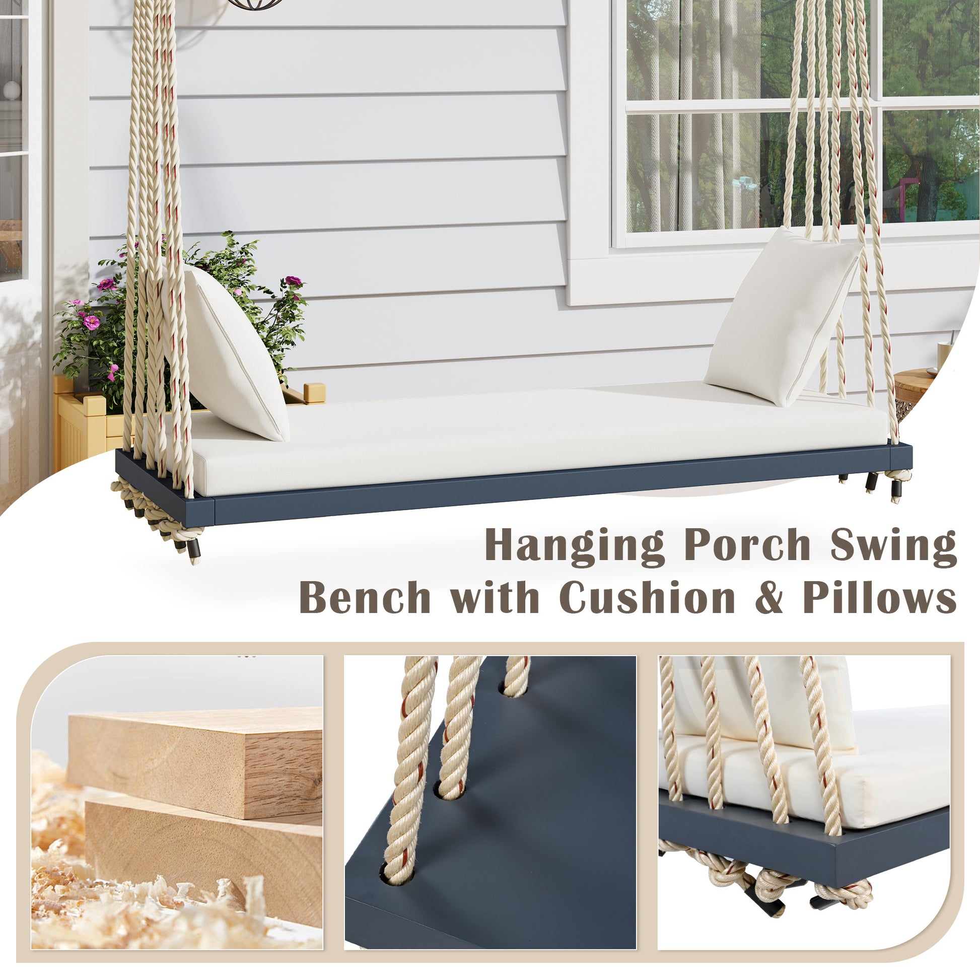 TOPMAX Patio Wooden Swing Chair, Hanging Porch Swing Bench with Cushion&Pillows, 10.8Ft Hemp Ropes for Garden,Backyard, Lawn,Gray