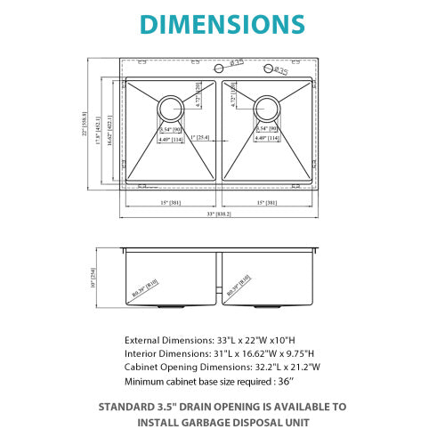 - [Dimensions] Exterior Dimensions: 33" x 22" x 10" (Minimum Recommended cabinet size: 36 inches). Left bowl size 15" x 16.62" , Right bowl size 15" x 16.62". Standard 3-1/2" drain opening fits most common garbage disposals. Recommended Cutout Size: 32.2 x 21.2 inches.
