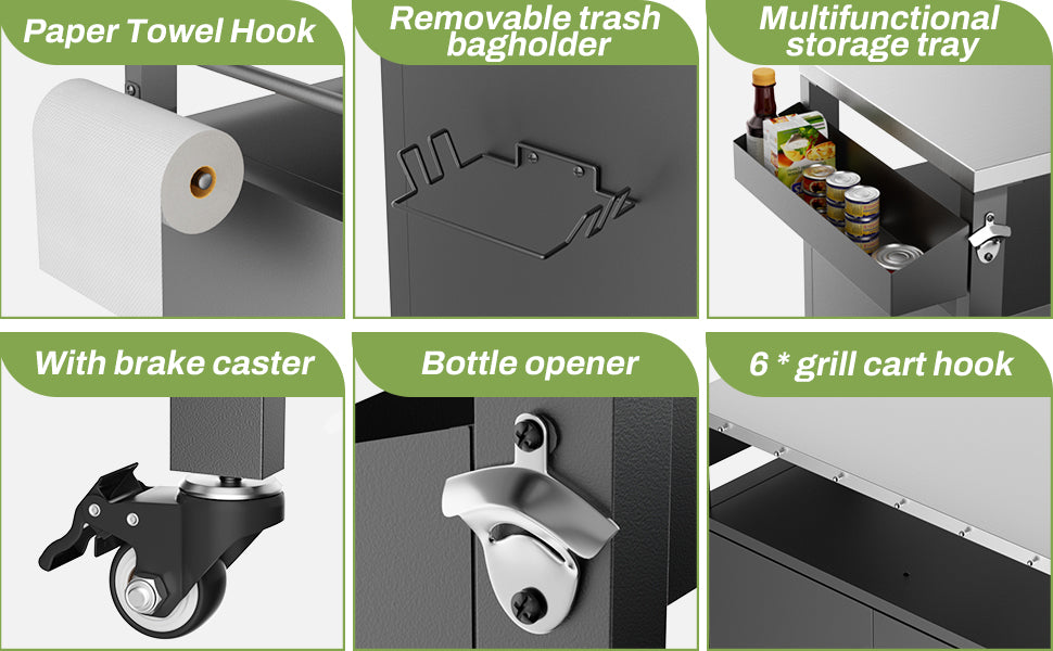 - ENOUGH SPACE & EASY INSTALLATION - There is enough space to place all cooking seasonings and sauces, as well as grill bottles. The outdoor cart comes with detailed instructions. If you encounter any problems during the installation process, we will provide you with professional help as soon as possible.