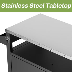 - STURDY AND DURABLE MATERIALS - The grill cart features heavy-duty square tube legs and a stainless steel tabletop, which is very stable and durable. The stainless steel tabletop provides a safe work surface that is easy to clean and maintain. The full cabinet is designed with two doors,the right side to store barbecue fuel, including propane tanks, charcoal, or wood chips. There is a movable layer board inside the left side.This outdoor bar cart is an outdoor entertainment necessity.