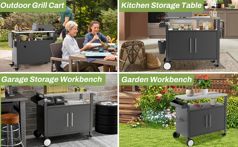 - ENRICHMENT OF INDOOR AND OUTDOOR ACTIVITIES - Outdoor grill cart elevates any patio or backyard party, making your outdoor storage easier and no longer messy. This grill cart comes with wheels and can be moved to anywhere you need it, whether indoors or outdoors, so that you can enjoy your food at any time!