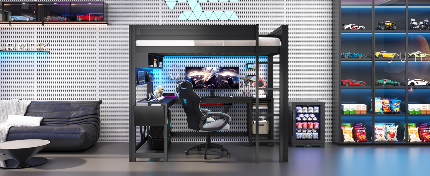 Wood Full Size Gaming Loft Bed with Desk, Storage Shelves, LED and Charging Station, Black