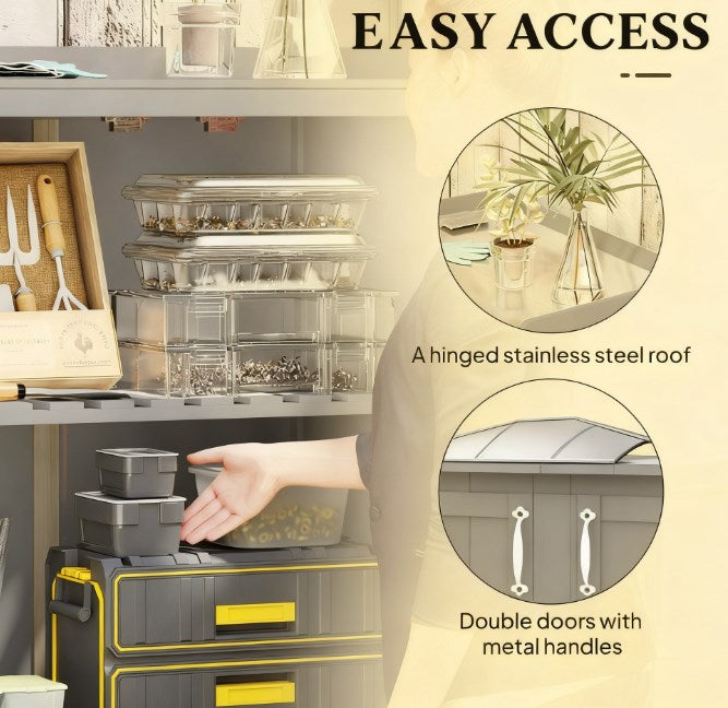 - - Convenient Access Features: Equipped with a hinged roof and double doors featuring metal handles, this garden shed allows easy and secure access to your tools and supplies