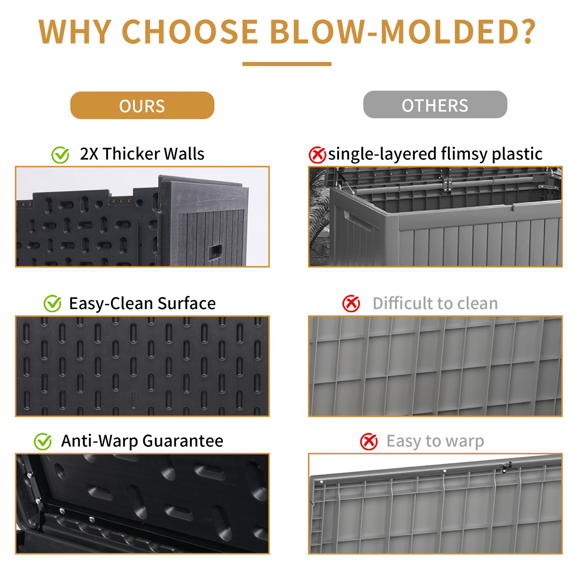 - Durable Outdoor Patio Box: This 260-gallon resin deck box is crafted from weather-resistant materials, double-layer cover design and solid structure, including bottom plate and bottom reinforcement ribs. It withstands various weather conditions while maintaining its appearance, making it a perfect addition to any garden, backyard, or patio.