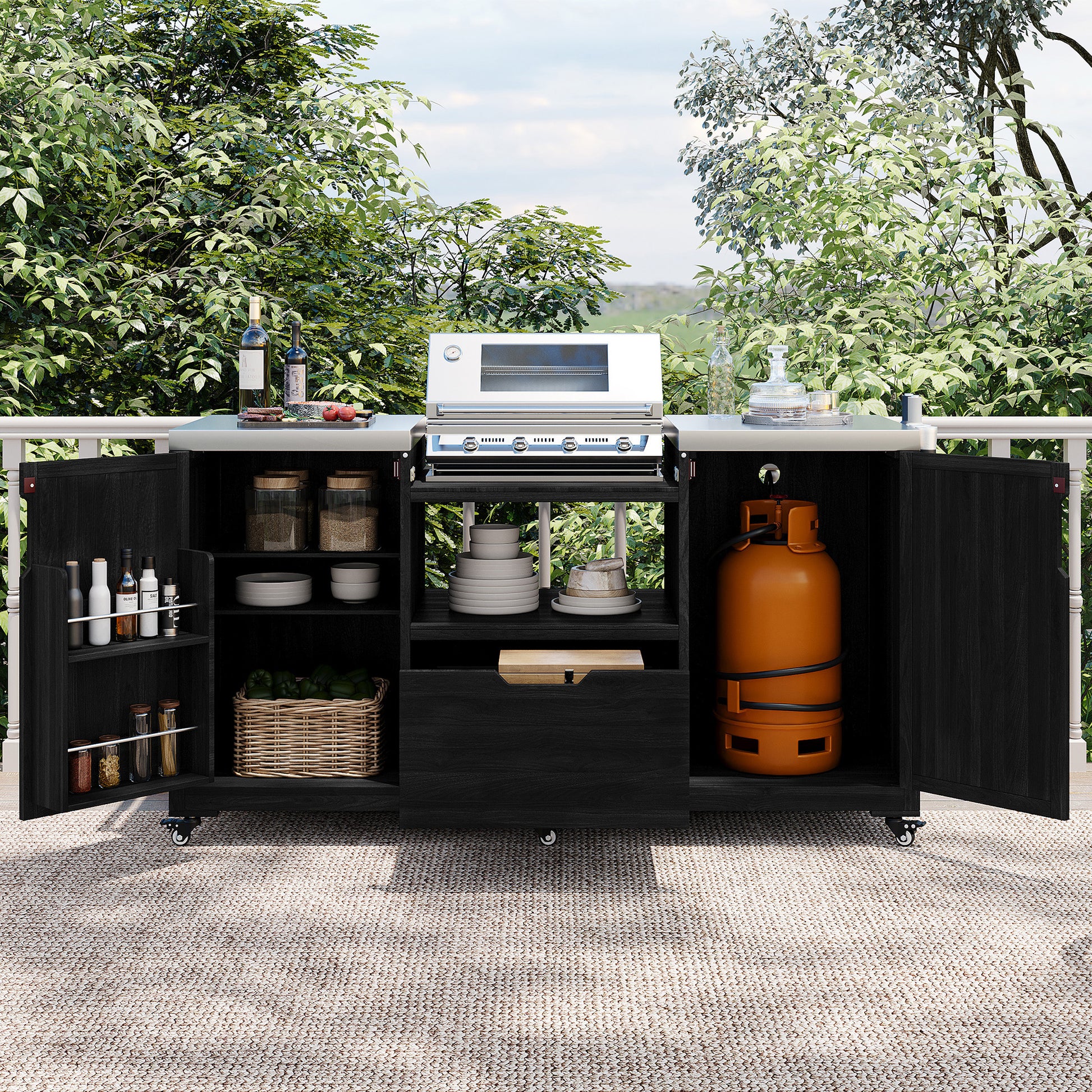 - [Ample Storage & Grill Space] The outdoor grill cart features a spacious central drawer, two cabinets and two 18.5” x 23” stainless steel tables at each end. By placing the middle adjustable shelf on top, you can connect them to create a large 60” x 23” table with a total work area of 1380 sq inches, ideal for any outdoor use. If you wish to utilize a gas grill on top and store a gas cylinder within the full cabinet, you can safely route the gas line through the exit hole for an optimal setup.