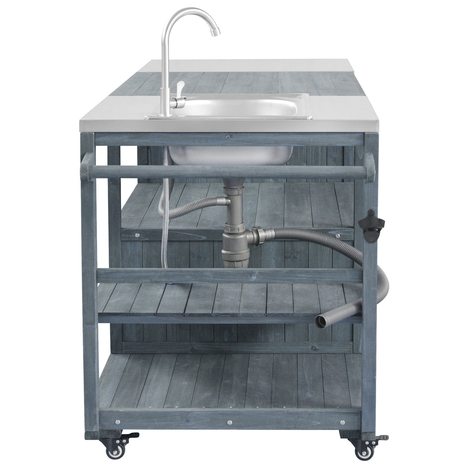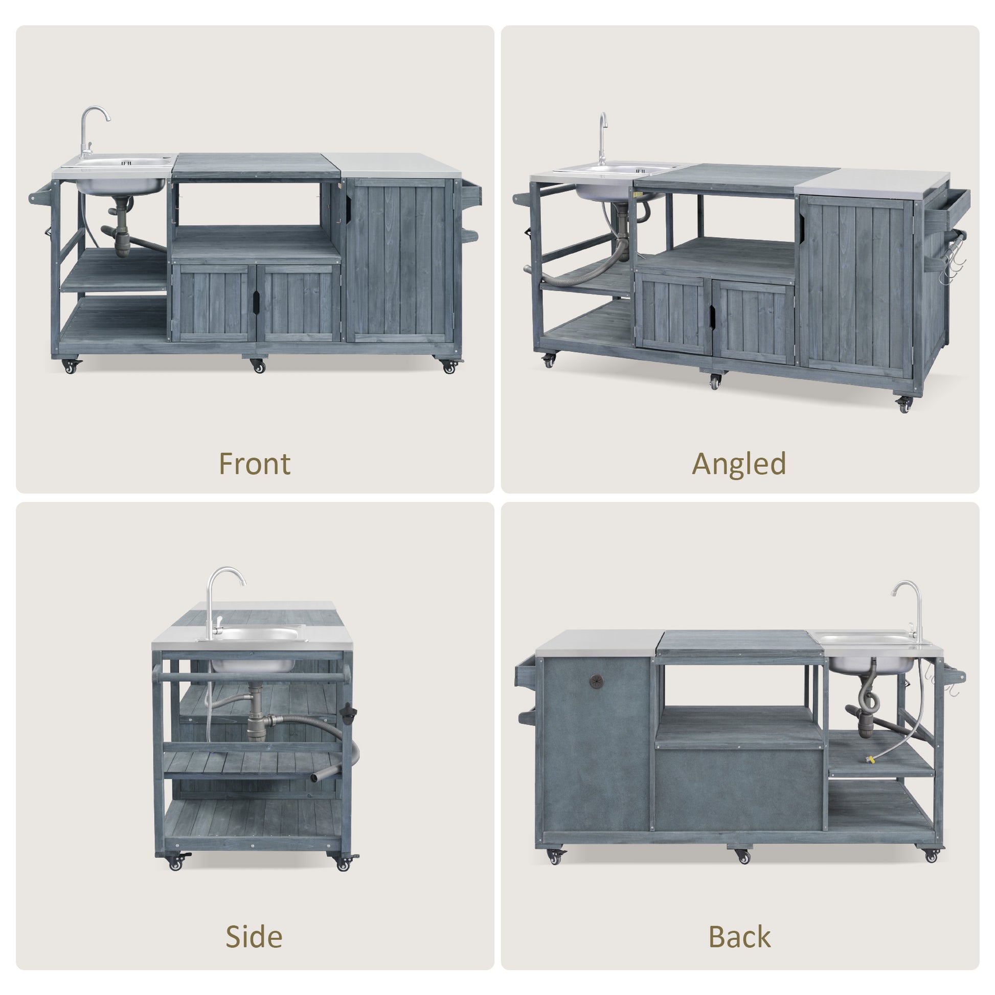 75.4" Outdoor Kitchen Island with Sink, Solid Wood Outdoor Grill Cart for XL Green Egg Grills, Rolling Outdoor Bar Cart with Stainless Steel Top, for Pizza Prep & BBQ, Grey Blue