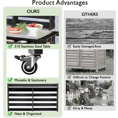 K&K 64.9"H Outdoor Potting Bench Table with Lockable Wheels, Solid Wood Outdoor Kitchen Island with Upper Hutch, Stainless Steel Top, Towel Rack ,Outdoor Storage for Grilling, Lawn Garden -Black