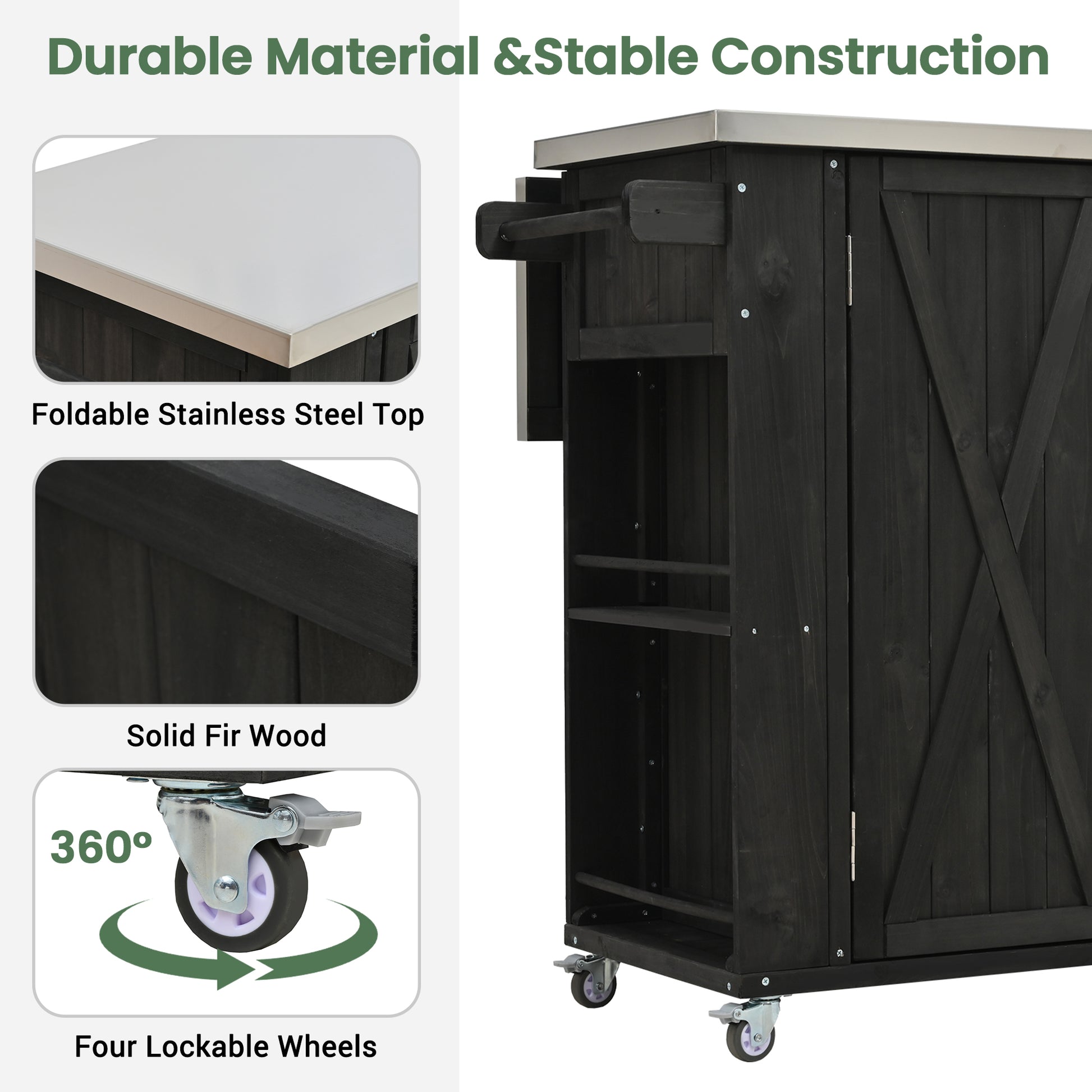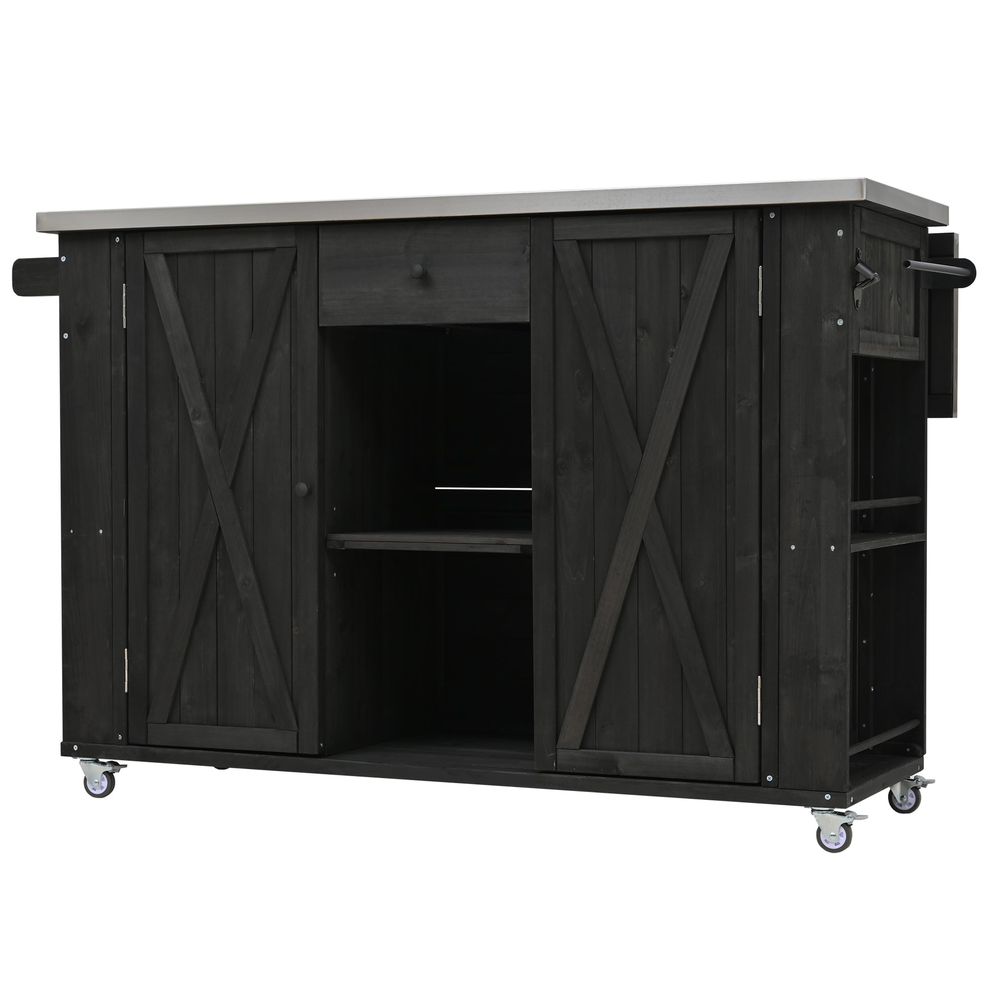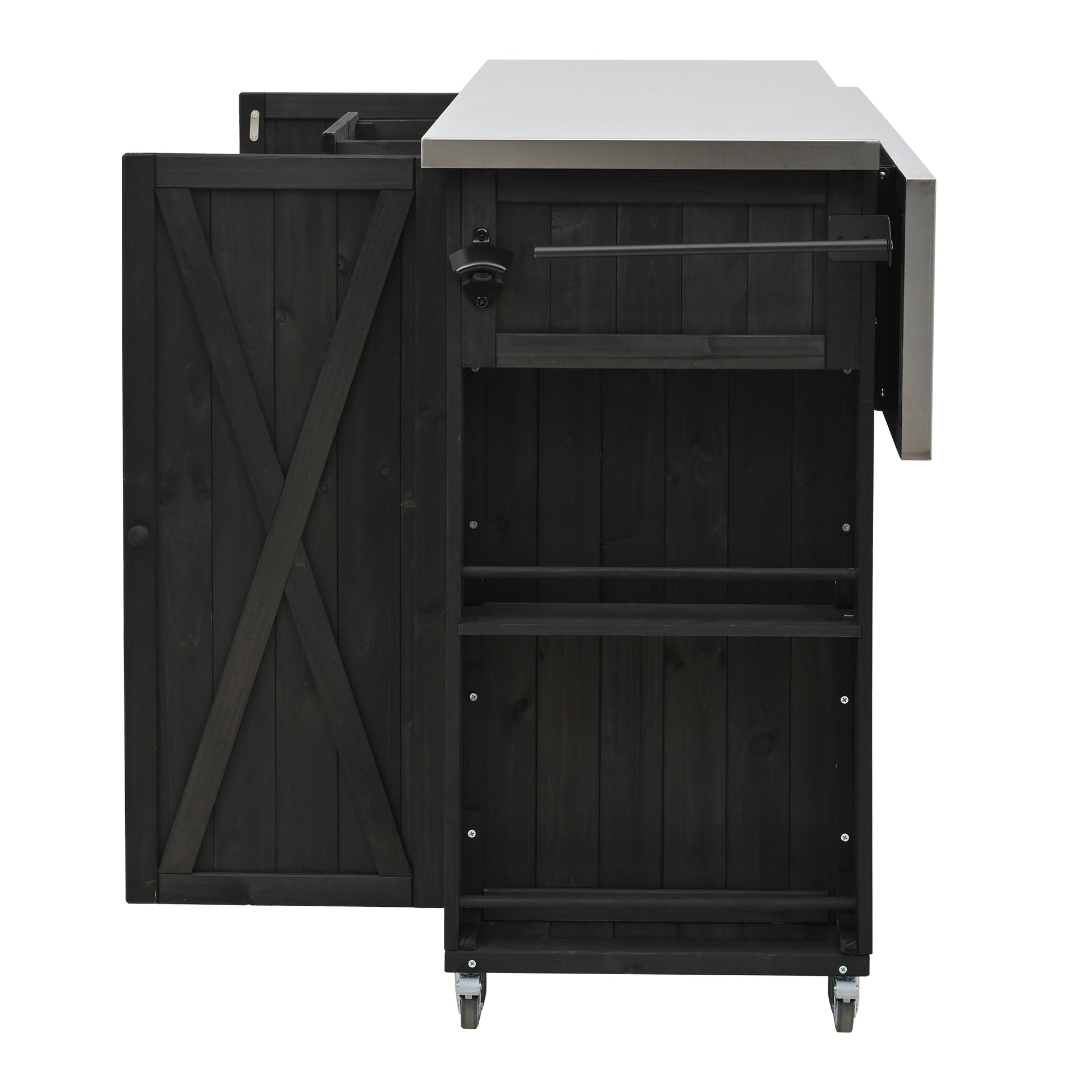 Outdoor Kitchen Island Fir Wood Kitchen Island with Stainless Steel Top, Ample Storage Space, Towel and Spice Racks and a Bottle Opener for Outdoor, Black