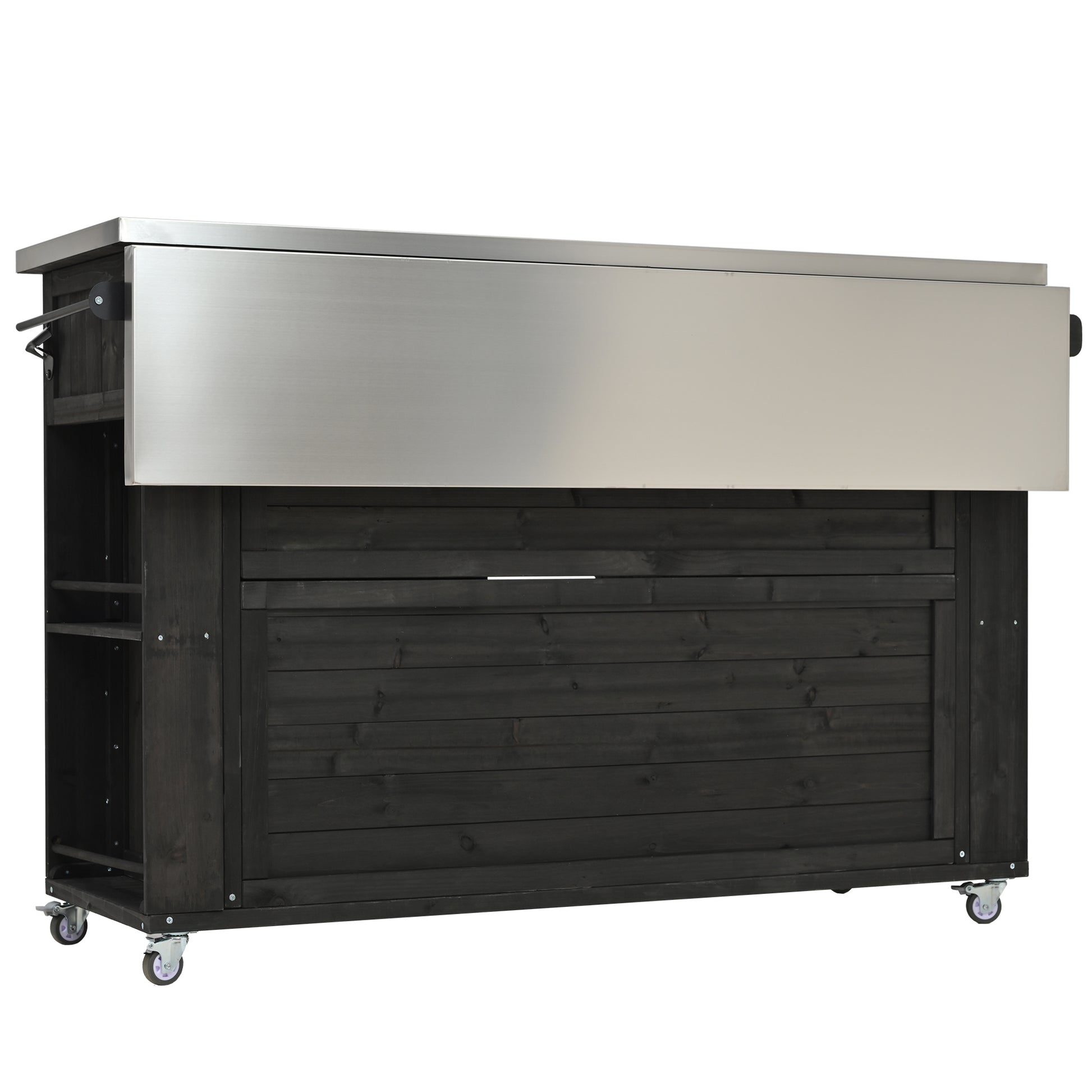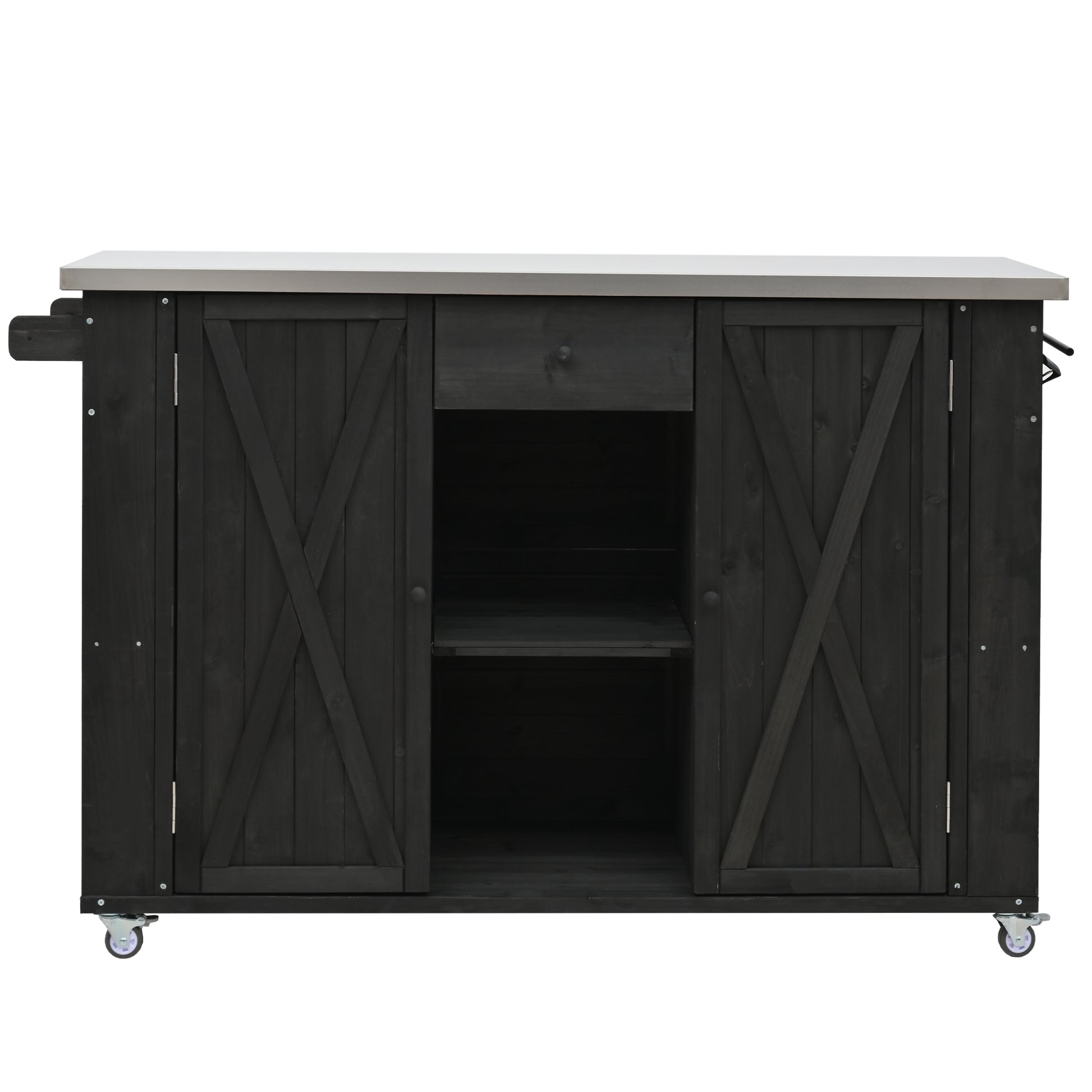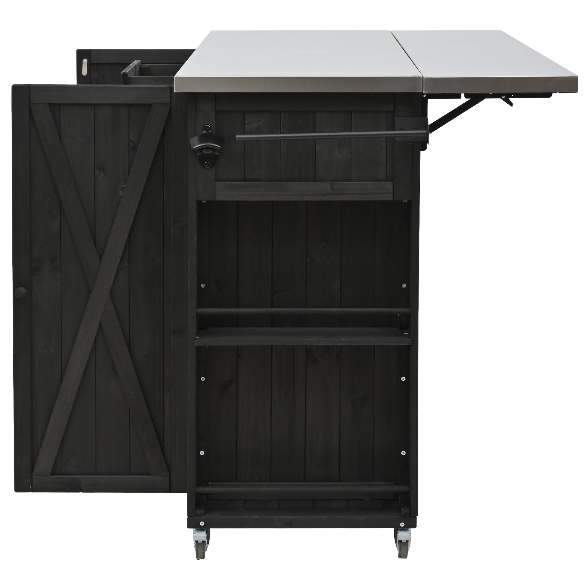 Outdoor Kitchen Island Fir Wood Kitchen Island with Stainless Steel Top, Ample Storage Space, Towel and Spice Racks and a Bottle Opener for Outdoor, Black