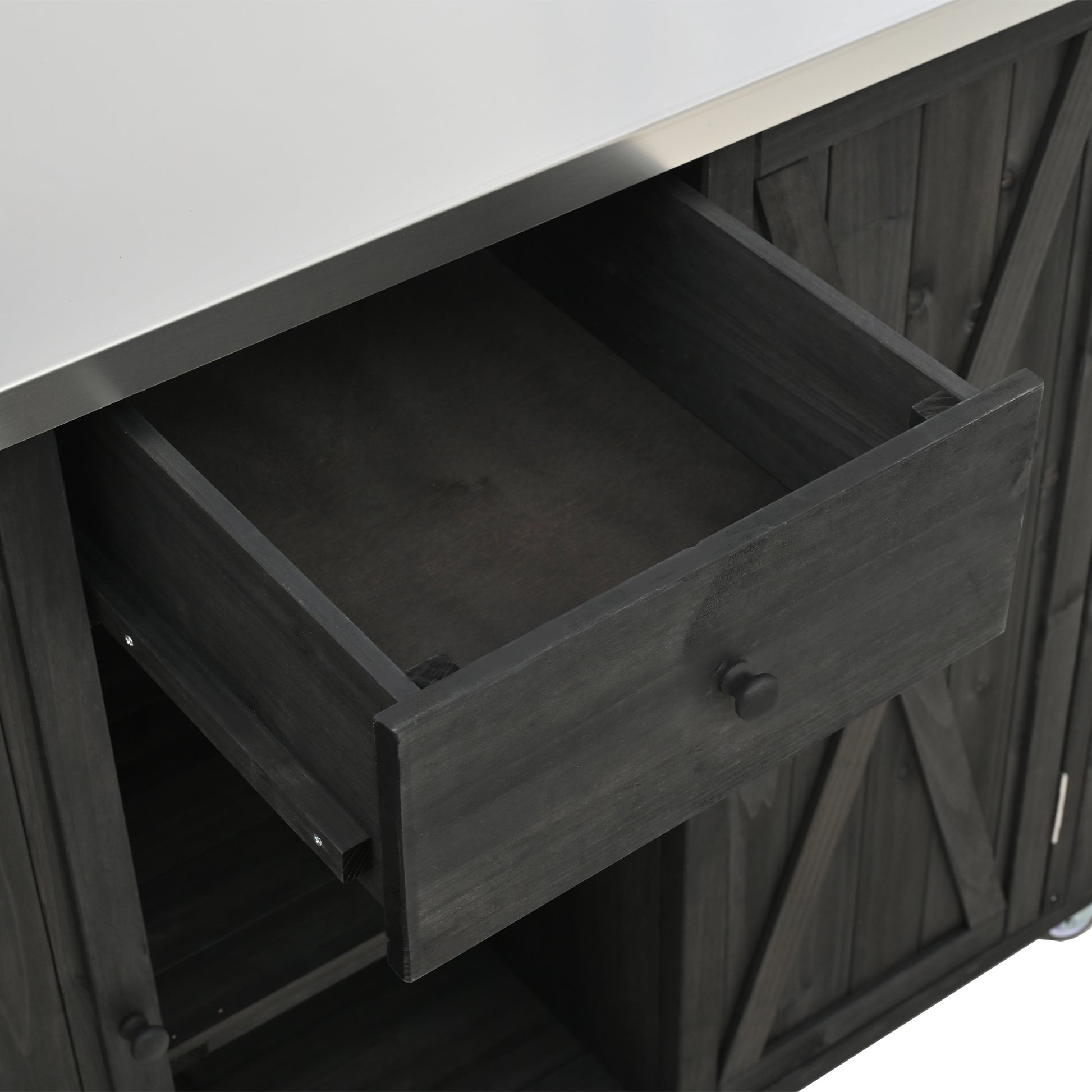 - Premium Stainless Steel Foldable Top - The island comes with a sleek, easy-to-maintain stainless steel countertop, providing a resilient and heat-resistant surface for food prep or serving. The unique design features a foldable half-top that allows you to expand the workspace when needed and fold it down to save space when it’s not in use, making it ideal for compact areas or changing needs.