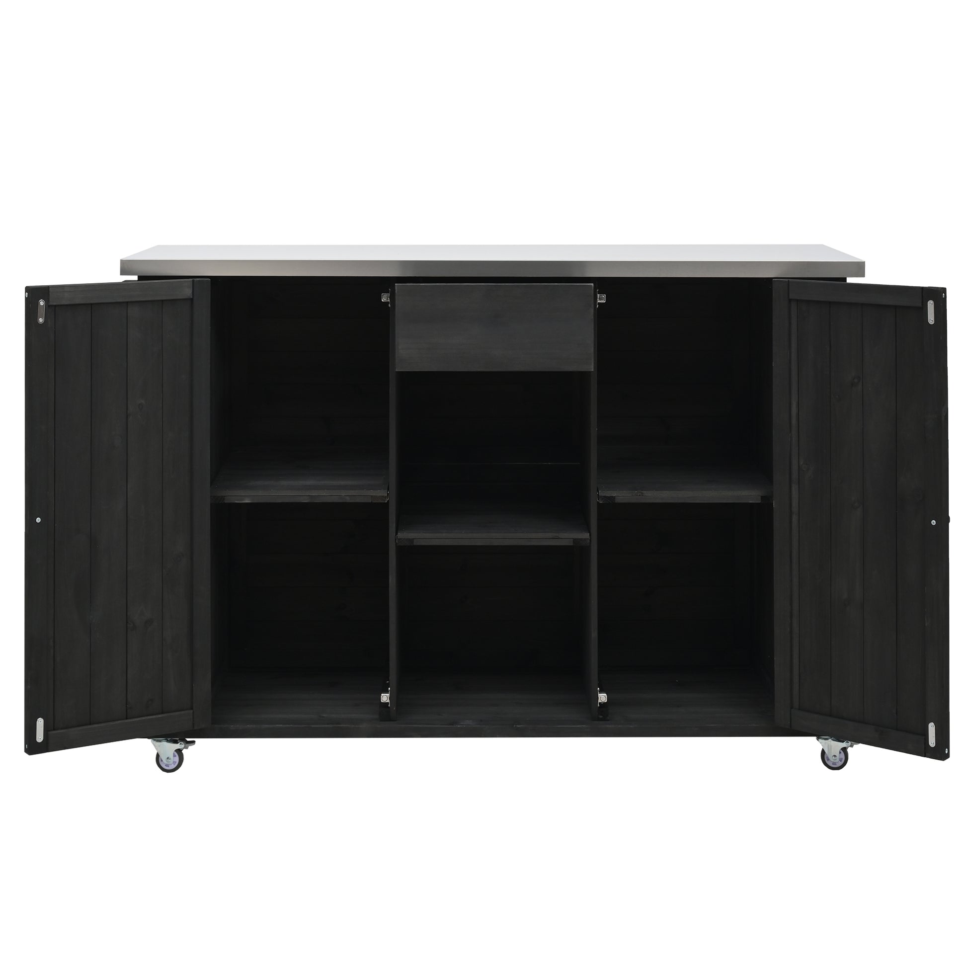 - Versatile Storage Options - This kitchen island includes two spacious storage compartments on each side with adjustable shelves, providing ample room for storing larger kitchen tools or other outdoor essentials. The center drawer offers a secure space for smaller items, and the two open shelves on either side allow for quick and easy access to frequently used items like plates or napkins.