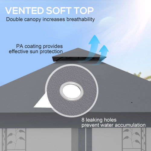 - Double Canopy: Stop sunburns. Our elegant 10x11.5 outdoor gazebo has a two-tier vented canopy that not only adds charm, but it also helps redirect wind flow, helping it stay up. If you forget to take it down before rain, grommets help the top drain away excess water, keeping weight off the frame.