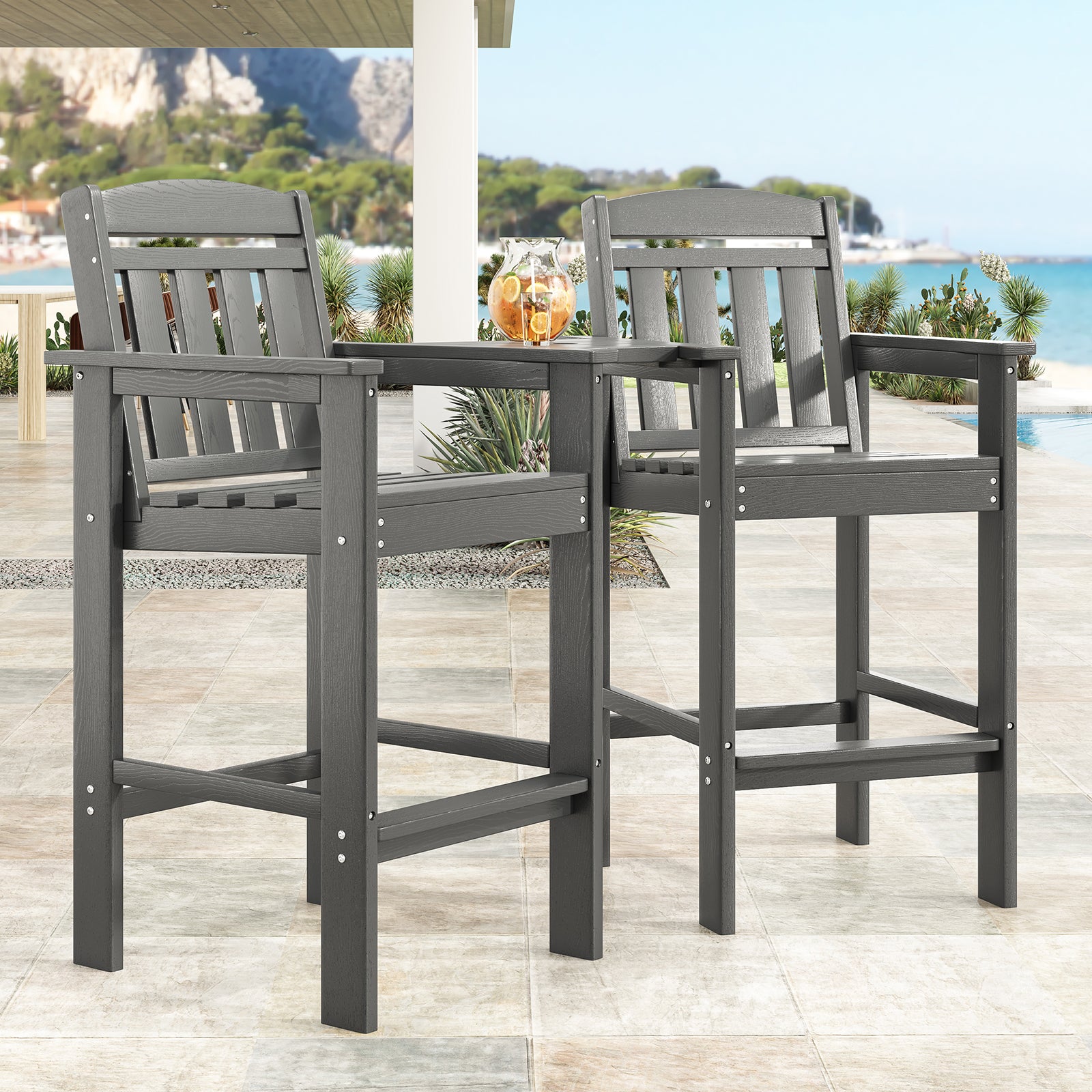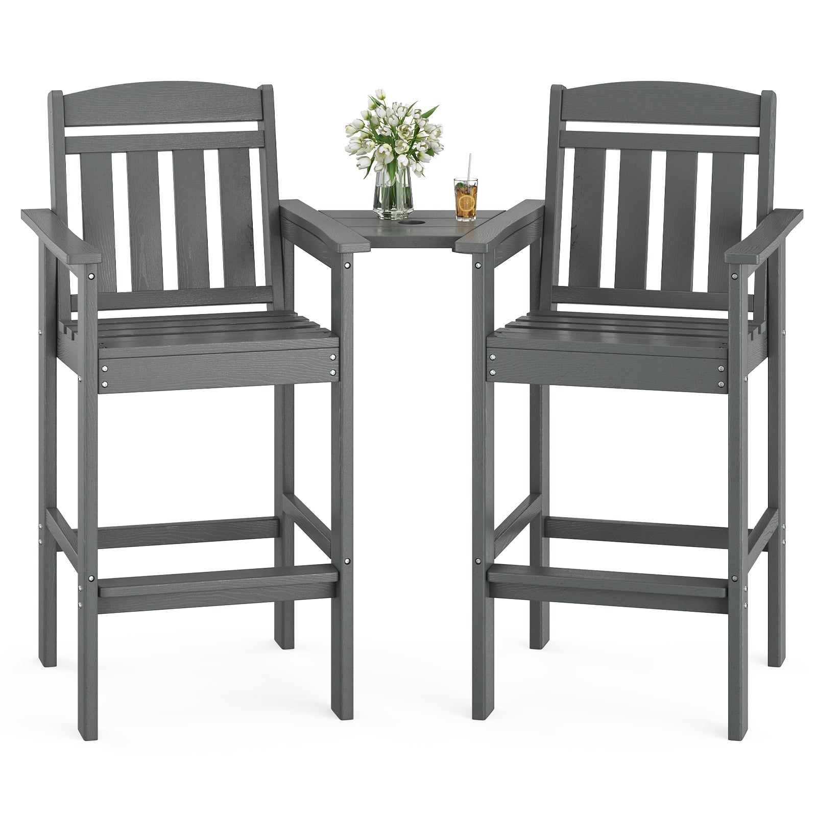 Tall Chairs Set of 2, HDPE Bar Stools with Connecting Tray, Bar Height Chair Patio Barstool, Ideal All Weather Tall Patio Chair for Balcony, Poolside, Backyard